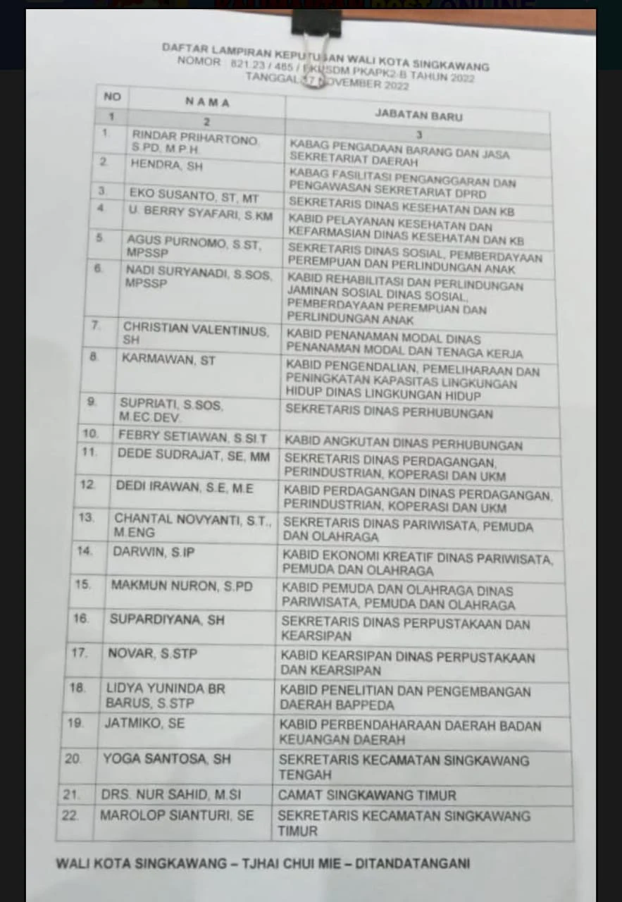 Singkawang.Kalimantanpost.online.-Tjhai Chui Mie Walikota Singkawang pada hari jumat tanggal 18 November 2022 melantik 2 KABAG, 8 SEKRETARIS, 11 KABID dan 1 CAMAT Di Lingkungan PEMKOT Singkawang. Acara pelantikkan di laksanakan diruang balairung kantor Walikota Singkawang.