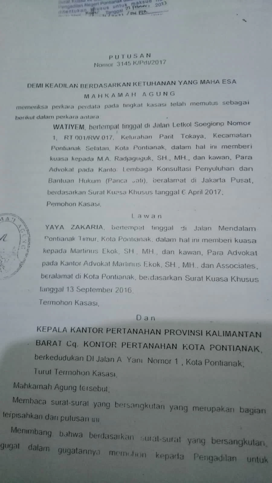 Penggugat WATIYEM Lawan YAYA ZAKARIA Dan BPN Kota Pontianak adalah diduga kesalahan/kekeliruan yang diduga sengaja dibuat dan disampaikan kepada YAYA ZAKARIA tentang Putusan Mahkamah Agung Perkara Nomor : 3145.K/Pdt/2017 yang seolah-olah dianggap resmi dan sah menurut Hukum, tetapi ternyata adanya kesalahan yang diduga sengaja direkayasa yang jelas merugikan Klien kami YAYA ZAKARIA.Surat penggugat berdasarkan surat jual beli 25 Juli 1961 tertera tampak depan - belakang – kiri – kanan, tetapi Putusan Kasasi tertera arah mata angin merubah dari bentuk surat tersebut.tanpa dasar.