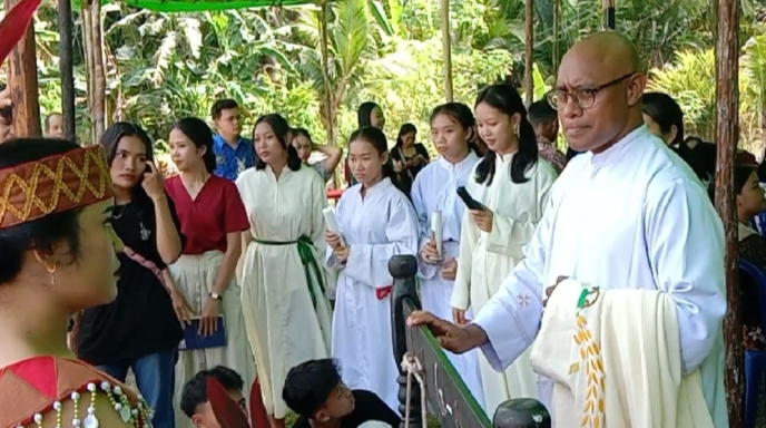 Acara dimulai dengan perarakan disambut dengan tarian oleh sanggar Tanyuk Bunga dan ritual adat setempat sambil diiringi untuk menuju tempat acara misa bersama yang sudah ditunggu oleh umat.