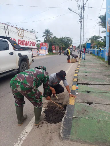 upaya menjaga kebersihan lingkungan dan Mencegah Tersumbatnya saluran drainase, Babinsa Kelurahan Pasiran, Serda Darmaji, bersama warga setempat menggelar kerja bakti membersihkan trotoar dan drainase bertempat di jalan Firdaus, Kelurahan Pasiran, Kecamatan Singkawang Barat, Kota Singkawang,